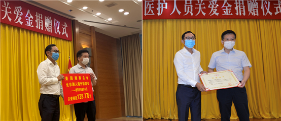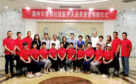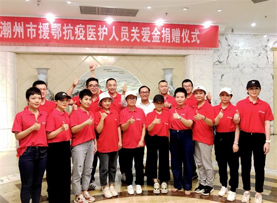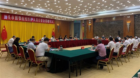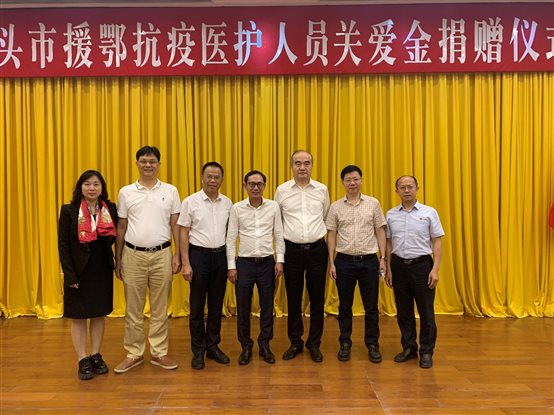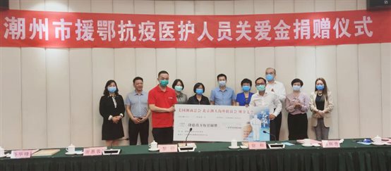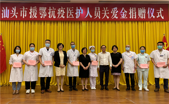 5月22日,在汕头市援鄂抗疫医护人员关爱金捐赠仪式上,向汕头市援鄂抗疫医疗队捐赠128.7万元的关爱金,表达对援鄂抗疫英雄们的敬意。