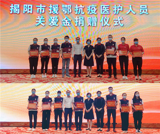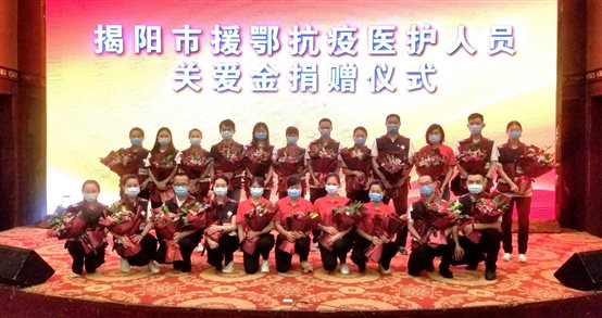 21日上午,在揭阳市援鄂抗疫医护人员关爱金捐赠仪式上,向揭阳市援鄂抗疫医疗队捐赠72.6万元的关爱金,表达对援鄂抗疫英雄们的敬意。