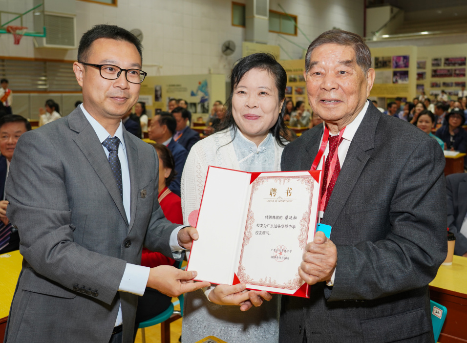 踔厉奋发的汕头华侨中学还在活动现场宣布成立发展顾问委员会、学术顾问委员会及校友顾问委员会三个侨校发展机构。北京潮人海外联谊会会长张章笋被聘为校友顾问,汕头华侨中学党委书记刘毅婉与校长李晓栓为莅临活动现场的这位“七五”届校友——张章笋颁发了聘书。