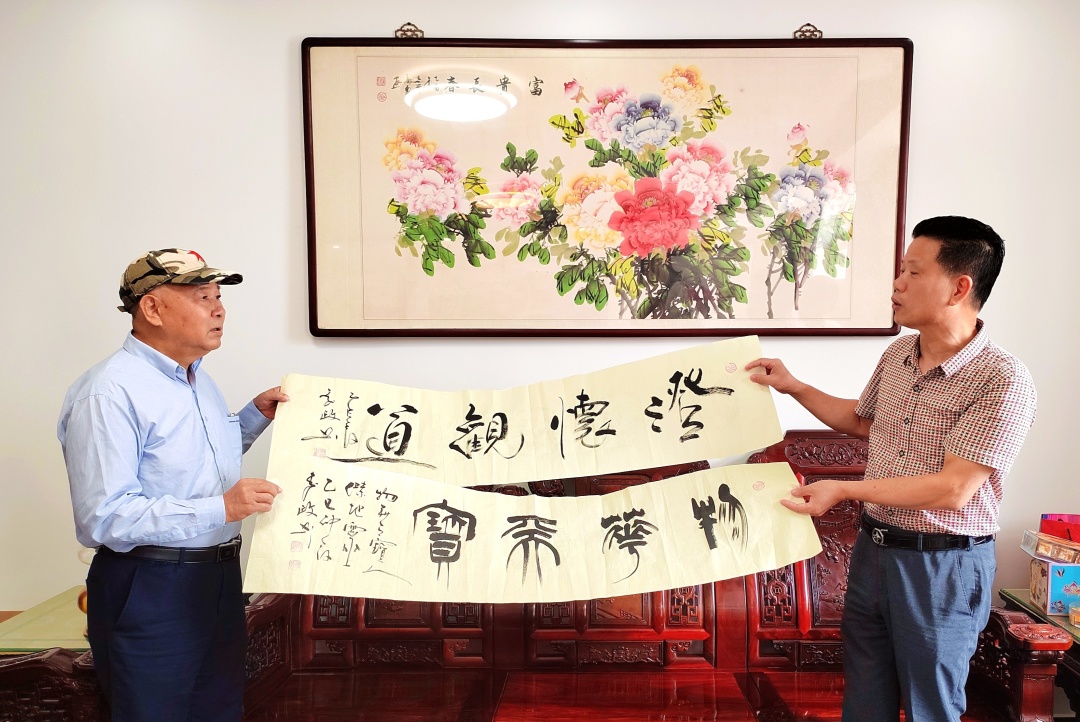 刘文雄会长代表分会向黄梅强董事长赠送知名书法家李政的两幅书法作品,此次访问活动在友好的氛围中圆满结束。潮阳潮南濠江分会常务副会长马庆、吴光廷、曾裕明,副会长徐洪波、许可新一同参加了走访交流学习活动。