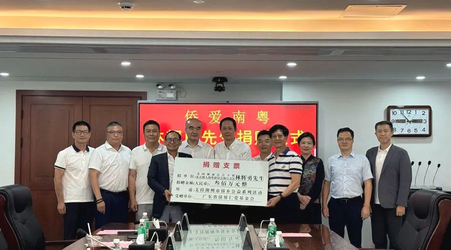 7月21日下午,“侨爱南粤・林辉勇先生捐赠仪式”在广东省侨联大厦举行。广东省侨联海外顾问、美国潮商总会主席、北京潮人海外联谊会执行会长林辉勇先生通过广东省侨界仁爱基金会,向潮州慈善总会捐赠300万元,用于支持潮州市侨乡“百千万工程”及在潮州举办的第二十三届国际潮团联谊年会等公益活动。广东省侨联党组书记、主席李丰,党组成员、副主席兼秘书长陈农灏,党组成员、副主席邵瑾;美国潮商总会主席、北京潮人海外联谊会执行会长林辉勇,美国潮商总会亚洲执行主席余泽龙,中国执行主席欧阳华,共同主席林全峰等出席仪式,广东省侨界仁爱基金会理事长郑楚雄主持仪式。
