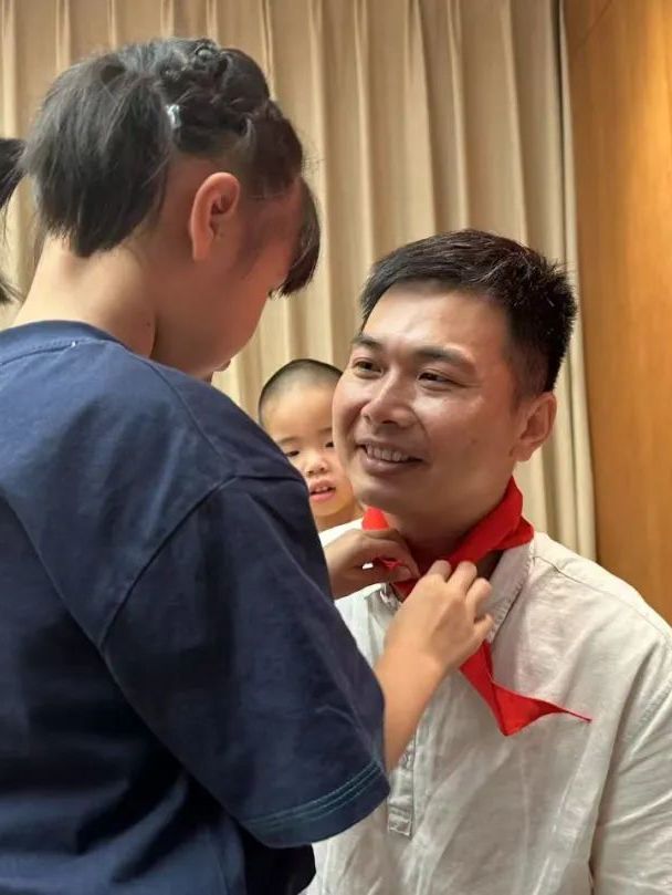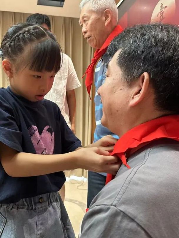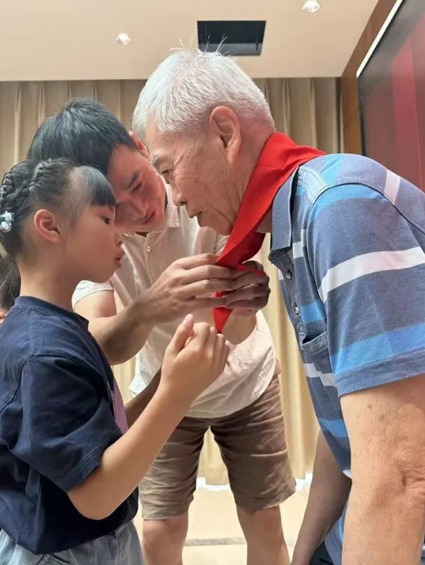 少先队员代表林晓悦小朋友为退役军人许乐雄、杜斌、林樾系上红领巾,并行少先队礼。鲜艳的红领巾映照着老中青三代战士们自豪的目光,似乎又想起他们曾经的军旅生活和胸前的军功章,赤诚的信念在向下一代人传递。