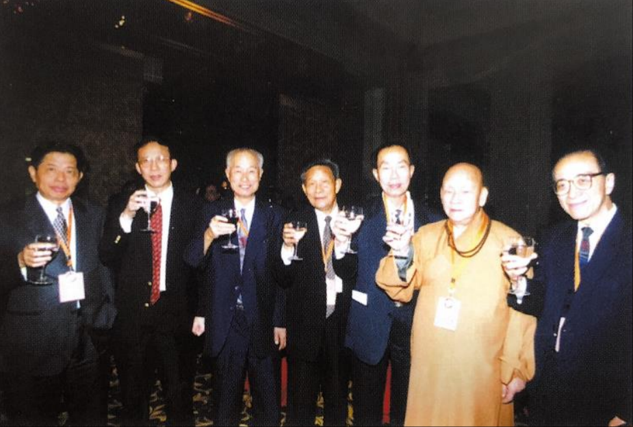 2001年10月19日,第十一届国际潮团联谊年会在北京人民大会堂召开。第十一届国际潮团联谊年会名誉主席朱良(右 1)与到会嘉宾合影留念