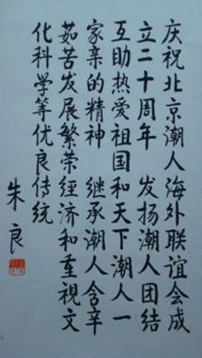 北京潮人海外联谊会成立 20 周年之际,朱良部长亲致贺词