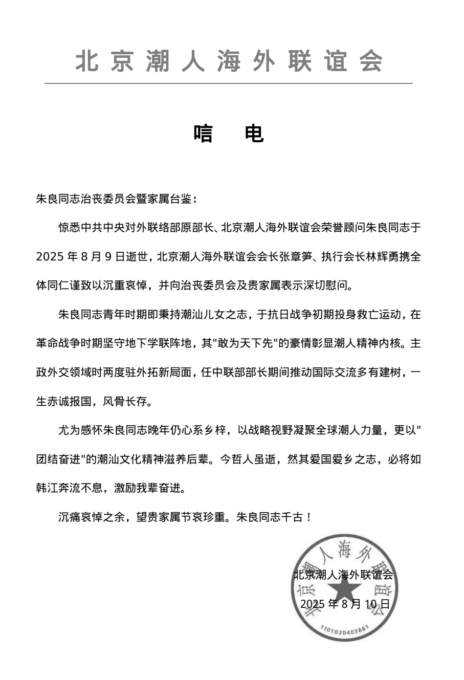 中国共产党优秀党员、久经考验的忠诚共产主义战士、我党对外工作杰出领导干部、中共中央对外联络部原部长、北京潮人海外联谊会荣誉顾问朱良同志,因病于2025年8月9日在北京逝世,享年101岁。