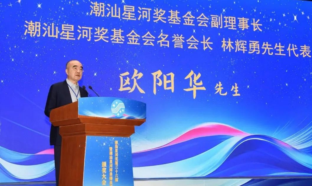 潮汕星河奖基金会名誉会长、美国潮商总会执行主席欧阳华先生代表潮汕星河奖基金会永远荣誉会长、美国潮商总会主席、北京潮人海外联谊会执行会长、潮汕星河辉勇师表奖捐资人林辉勇先生致辞,向获得本届潮汕星河辉勇师表奖的98名优秀教师表示祝贺和敬意。