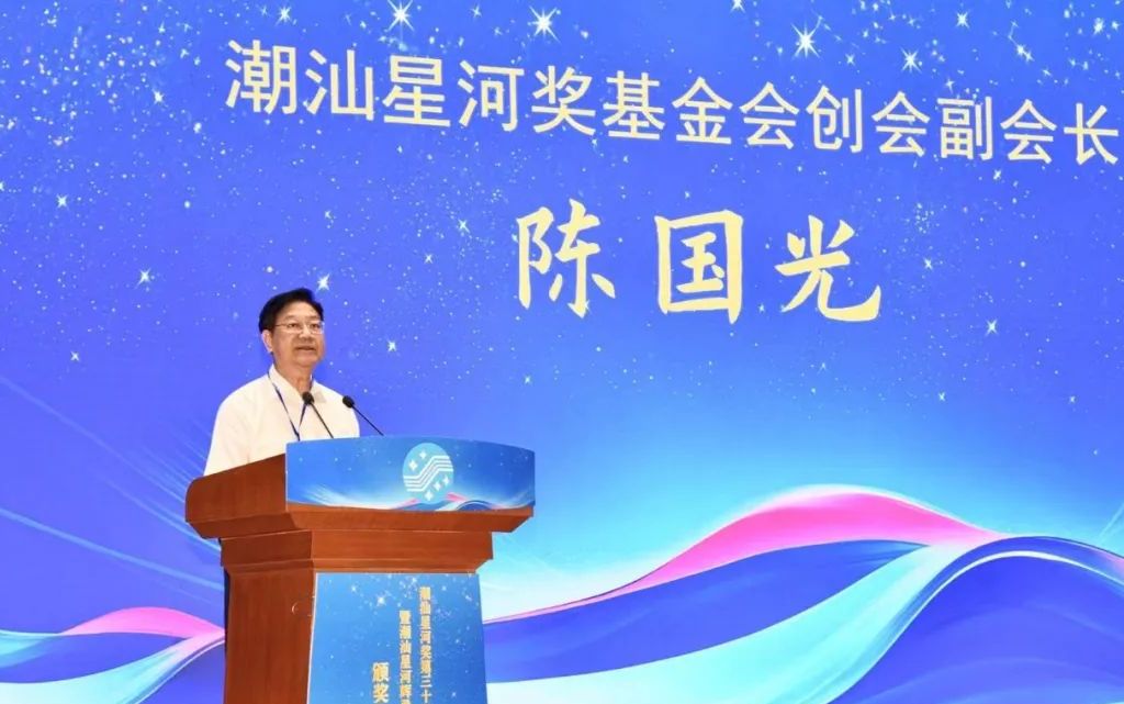 潮汕星河奖基金会创会副会长陈国光在会上致辞。他回顾了基金会的发展历程和收获,对潮汕三市党政各社会各界对星河事业的关心支持表示感谢。